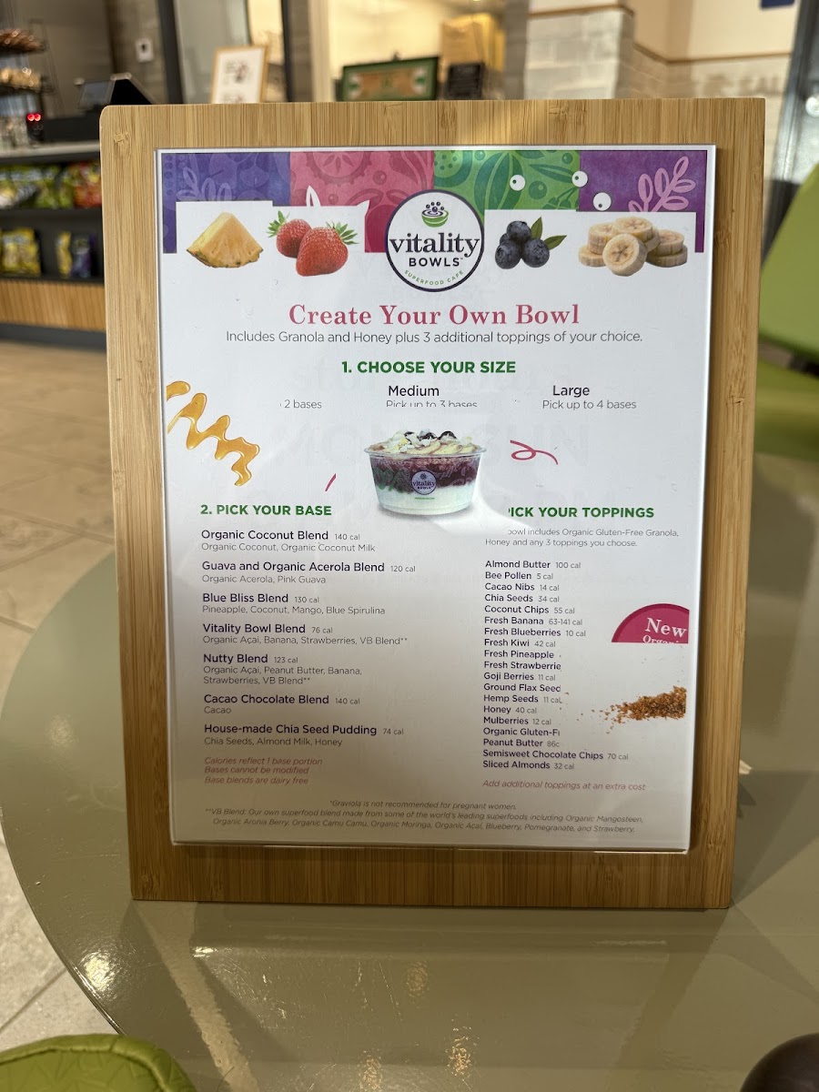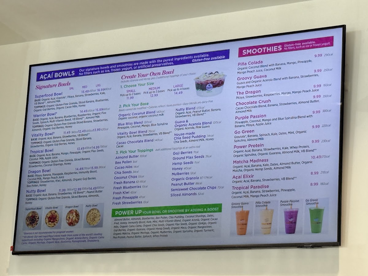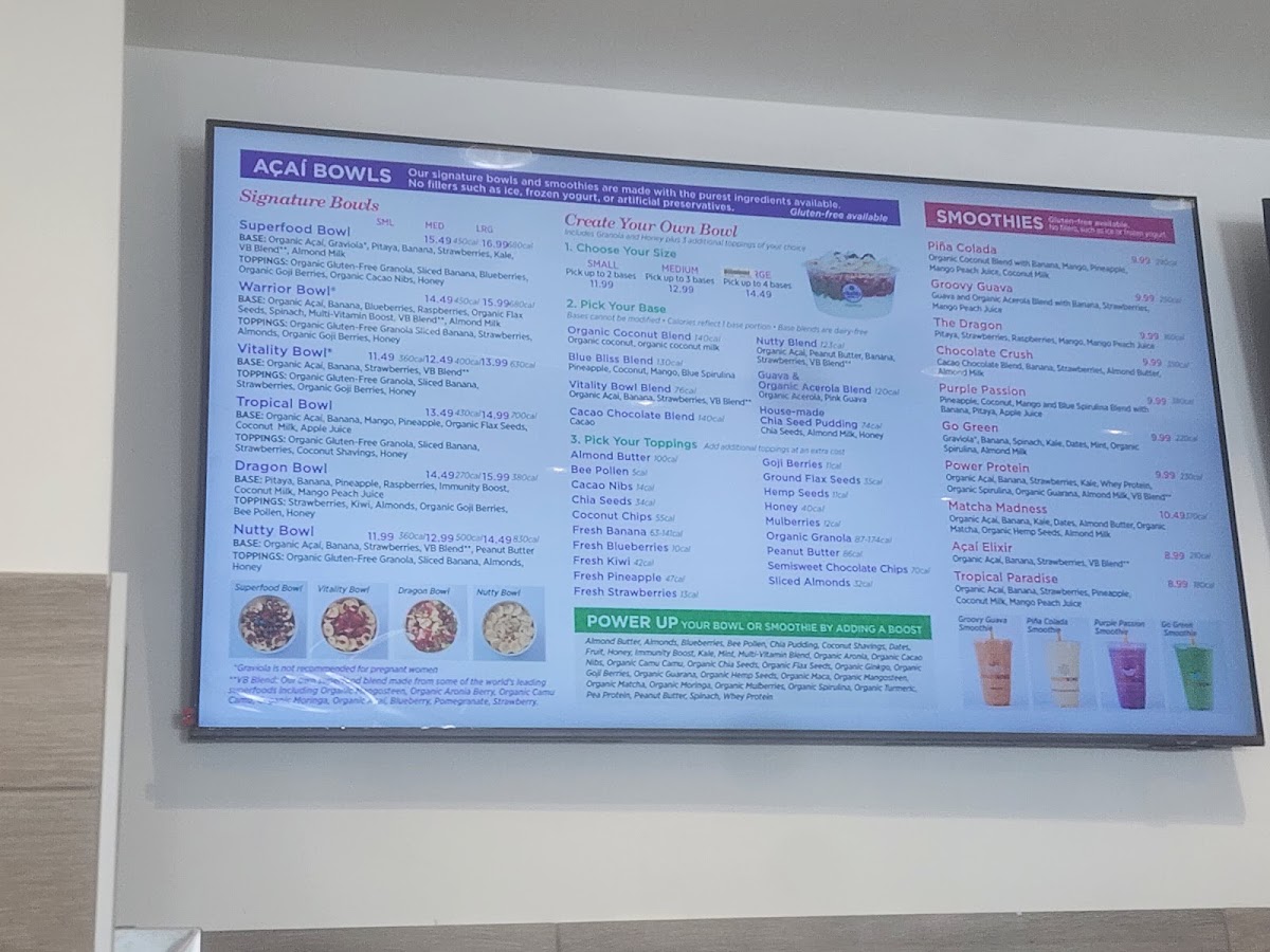 BASE: Organic Açaí, Banana, Blueberries, Raspberries, Organic Flax Seeds, Spinach, Multi-Vitamin Boost, VB Blend**, Almond Milk TOPPINGS: Organic Gluten-Free Granola, Sliced Banana, Strawberries, Almonds, Organic Goji Berries, Honey